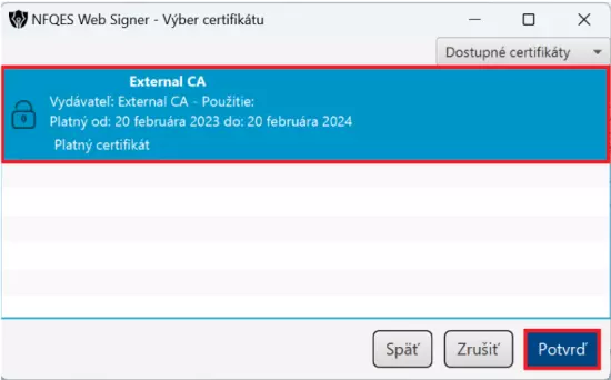 8. Zobrazí sa vám okno s vašimi certifikátmi, vyberte ten, ktorým chcete dokumenty podpísať a kliknite na tlačidlo "Potvrď".